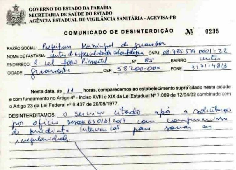 A Agência Estadual de Vigilância Sanitária (AGEVISA) interditou o Centro de Especialidades Odontológicas (CEO) do município de Guarabira (PB) por estar funcionando fora dos padrões exigidos, conforme noticiou o Caderno de Matérias do Ikeda Gomes.